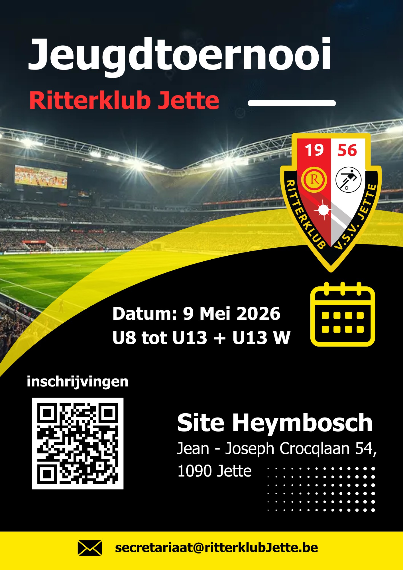 Jeugdtornooi 9 mei 2026 Op 9 mei 2026 organiseren wij ons jeugdtornooien. AM : U8-U9- U10-U11 PM : U12-U13-U13W SITE HEYMBOSCHJean-Joseph Crocqlaan 541090 Jette Meer